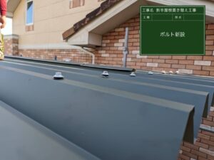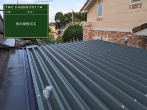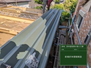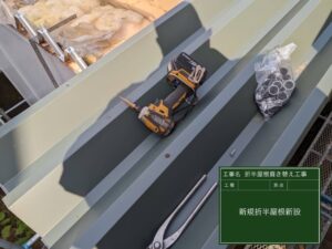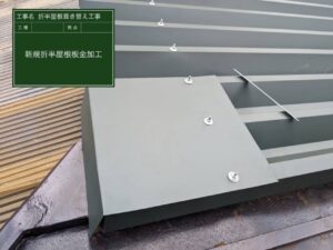 フレームに合わせて新規折板屋根を取り付けていきます。