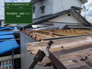 既存の折板屋根を捲り、新しくタイトフレームをとりつけていきます。