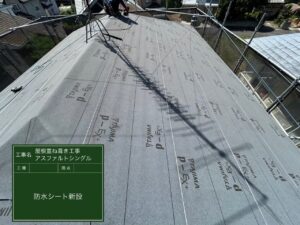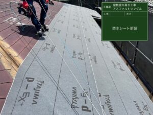 撤去後に、既存屋根の上からルーフィングシートを張っていきます。