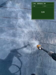 まずは高圧洗浄にて屋根に溜まった汚れと旧塗膜を洗い流します。