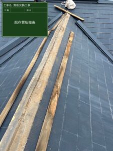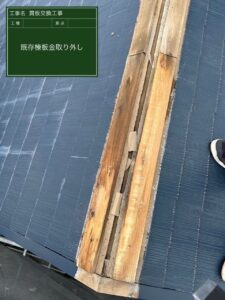 まずは既存の棟板金を取り外し、下地の貫板を撤去していきます。