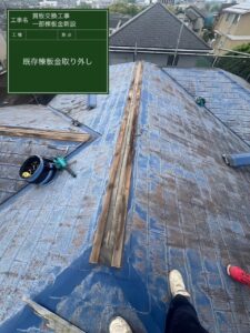 既存の棟板金を取り外すと、このように下地の貫板が現れます。