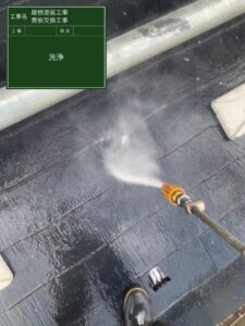 まずは高圧洗浄にて屋根に溜まった汚れや旧塗膜を洗い流していきます。