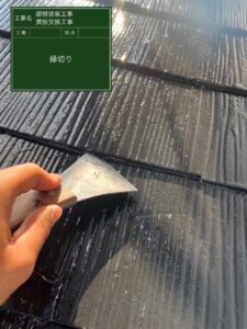 画像のように屋根材が重なる部分をカッターなどを使用して、隙間をカットしていく作業です。