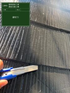 画像のように屋根材が重なる部分をカッターなどを使用して、隙間をカットしていく作業です。