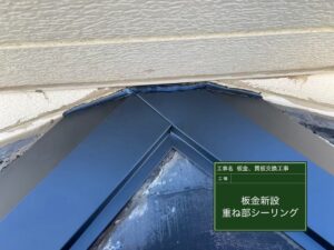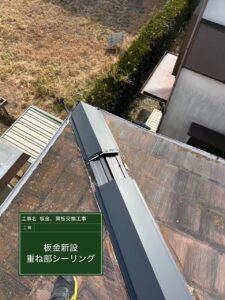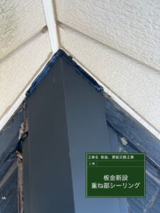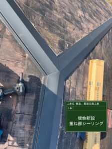 最後に棟板金の継ぎ目、重ね部にシーリングをうって接着力を高めて取り付けていきます。