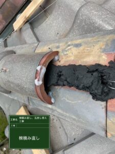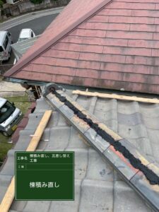 まずは歪みのある棟瓦の積み直しを行っていきます。