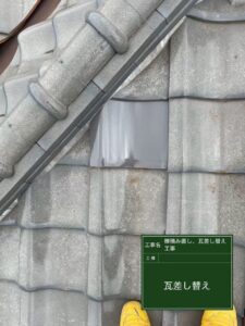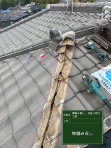 今回は、瓦を新しい瓦へ差し替え補修、さらに、棟部分の瓦(棟瓦)が歪み・ずれを起こしていたため、この機会に棟瓦の積み直し工事をご提案させて頂きました。
