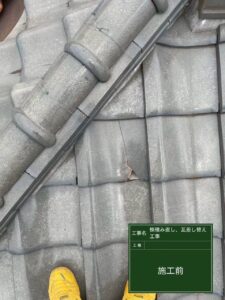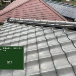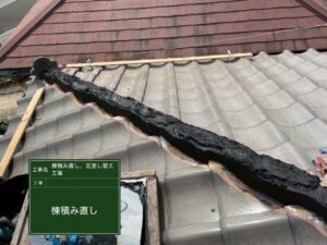 今回は、瓦を新しい瓦へ差し替え補修、さらに、棟部分の瓦(棟瓦)が歪み・ずれを起こしていたため、この機会に棟瓦の積み直し工事をご提案させて頂きました。
