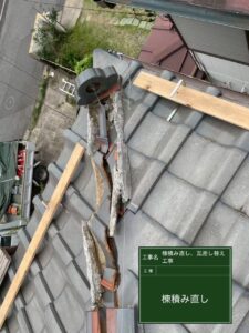 まずは歪みのある棟瓦の積み直しを行っていきます。