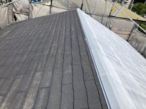 スレート系屋根や金属屋根で多く見られるのが、棟板金(屋根の頂点の板金部)の浮きや外れ、釘の抜けです。